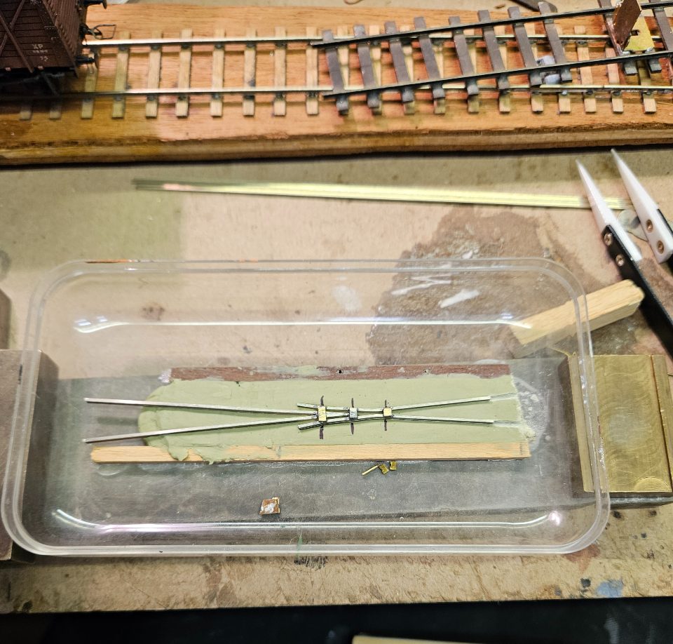 Friday was more trackwork from Luke and Mr C. For the project we had been donated two common crossings (1 in 6) and three V’s for the four turnouts in bullhead track. So two more common crossings are needed. So Mr C made a quick jig by mixing up some Milliput and pressing the made-up crossing into it to form a template. You can see before and after pics below. The first resulting crossing looks good and checks out with the gauges.