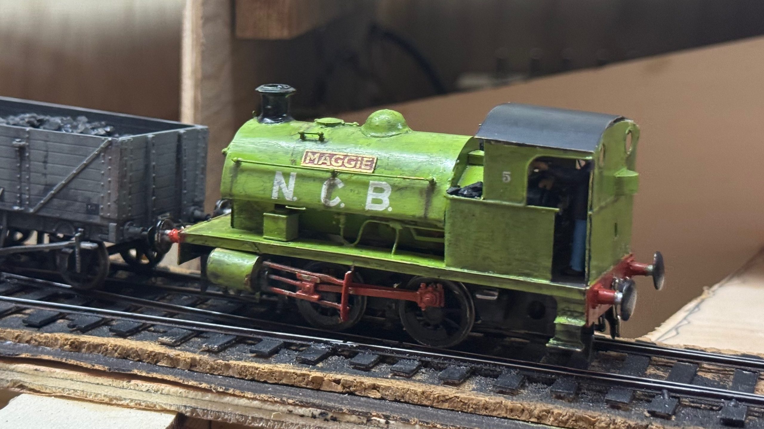Maggie was built from a High Level kit by Mike E and is now part of the roster for Cwmcarno. Luke has managed to fit a chip inside it somewhere between the frames. It had lost a crankpin nut and bearing on a front driver, but Mr. C has put that right. The running is better but there is still a tight spot. Also as you can see the cab roof is a bit wonky, so some small magnets will help that.