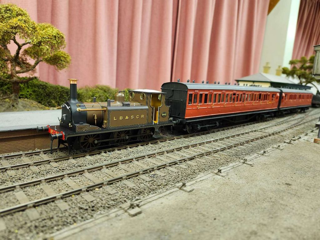 Frecclesham has been assembled to ready it for the Bristol Show at Thornbury. With the track cleaned Wagonman brought along the Lyme Regis set and other coaches for checking. He also brought this charming Terrier – one of his collection of four of these engines. All performed properly.