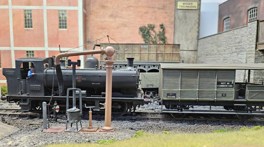 There is a second pannier tank available, this one built and weathered by Fred Lewis. 3603 is on coal train duty and here it has propelled the brake van up to the end of the platform ready to push the full wagons on to it. Another new loco is large Prairie 6116, a Heljan product, which spends most of its time on the B-set. This shot also shows some improvements made over the years – the additional cloth ‘sky’ which is velcro-ed over the layout to cut out unwanted lights and shadows, as well as the ground signals and water crane.