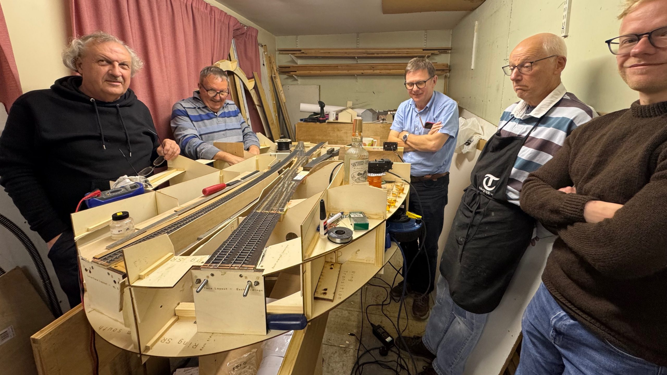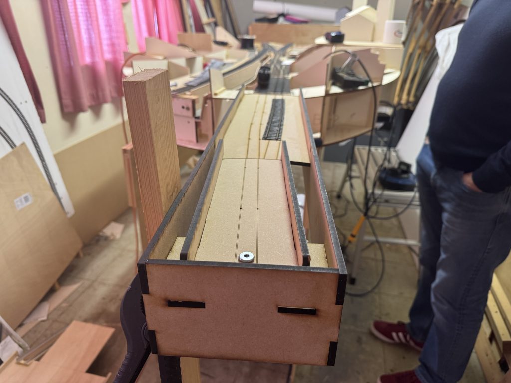 Monday and just a handful of us were present. Paul🏅🏅made the ‘halo’ for Cwm Carno (see Tuesday) Tuesday saw some significant Cwm Carno progress. TAFKATYS arrived with some supports for Cwm Carno. The legs were recycled from end protectors of LMJ baseboards – it was good quality plywood. New beams connect the legs and are very sturdy. The layout was tried in place easily and the upper section (halo) which will have a fascia and LED lights temporarily held up in place. Once the fascia is attached the halo will be far more rigid.