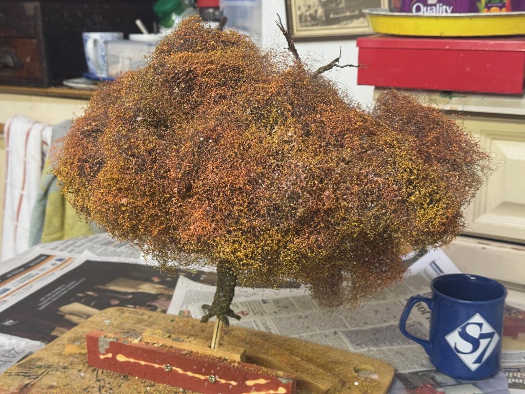 TAFKATYS has turned his eyes his Glanfa Newydd y Camlas, his new 7mm scale narrow gauge layout, and is building this rather majestic autumnal tree. The tea mug (inevitably in shot) gives some idea of scale.