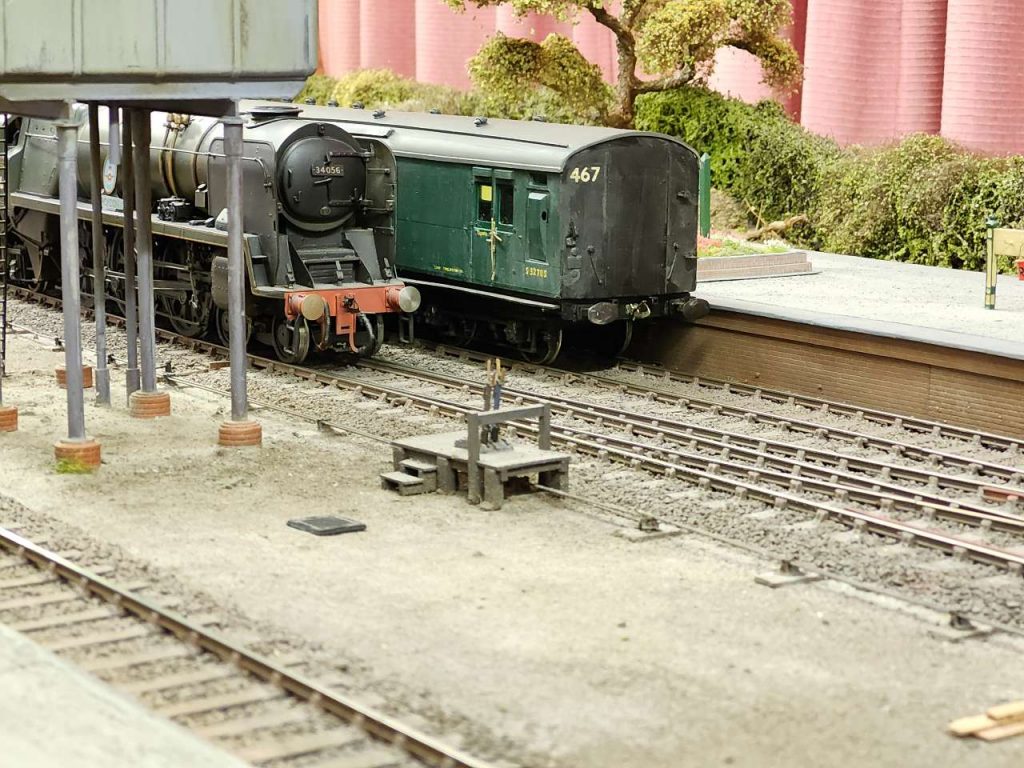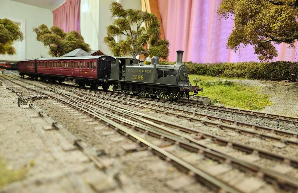 A new addition to the rolling stock on Frecclesham is the dark maroon pull-push set hauled by D1 0-4-2 tank 2296. The loco has been available for some time and acted as a standby, but finally it has its own stock. At the other end of the locomotive scale is Bullied pacific ‘Croydon’ which is just performing its run-round. All three shots emphasise how a back-scene is valuable in ‘suspending disbelief’.